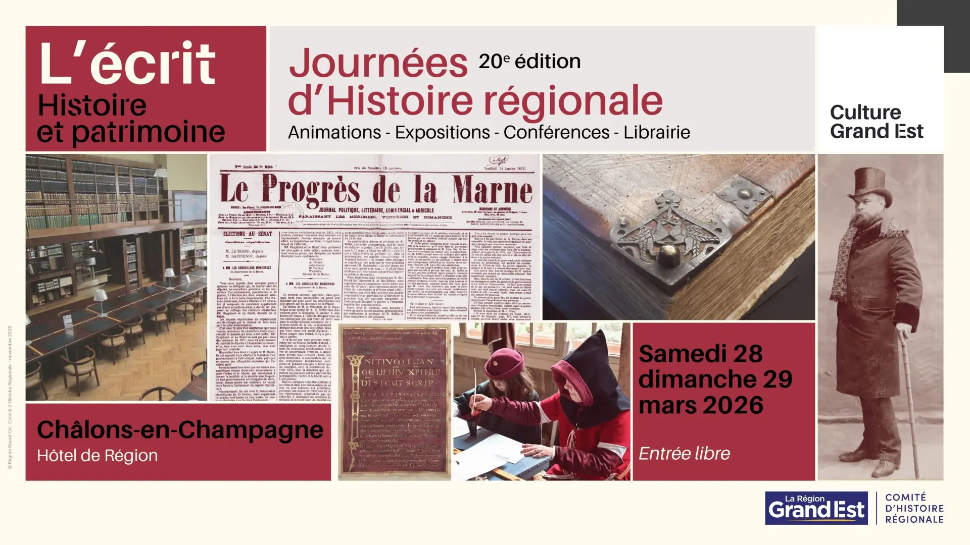 Nous y serons vite ! les Journées d'Histoire Régionale auront lieu les 28 et 29 mars 2026 avec pour cadre l'hôtel de Région de Châlons-en-Champagne (51). Le thème est : "L'écrit. Histoire et patrimoine"
